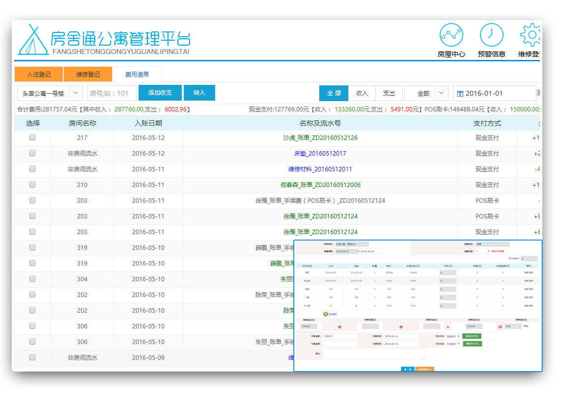 支付方式;房間費用收支流水可追溯來源,收